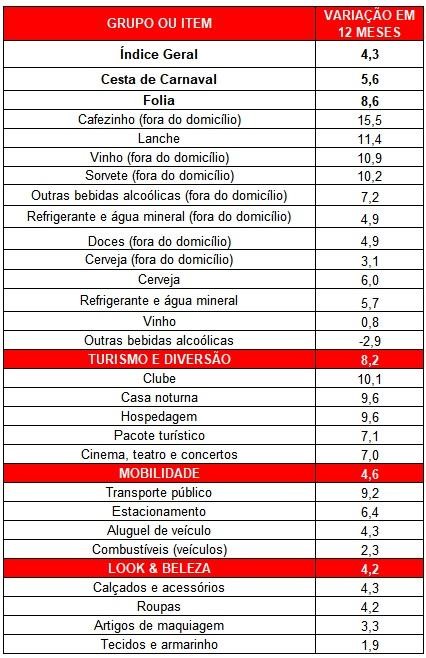 Levantamento realizado pelas entidades, com base no Índice Nacional de Preços ao Consumidor Amplo (IPCA), apontou aumentos de preços bem acima da inflação geral (4,3%) nos “itens da folia” e também na cesta de carnaval, que apresenta elevação de 5,6% em 12 meses.