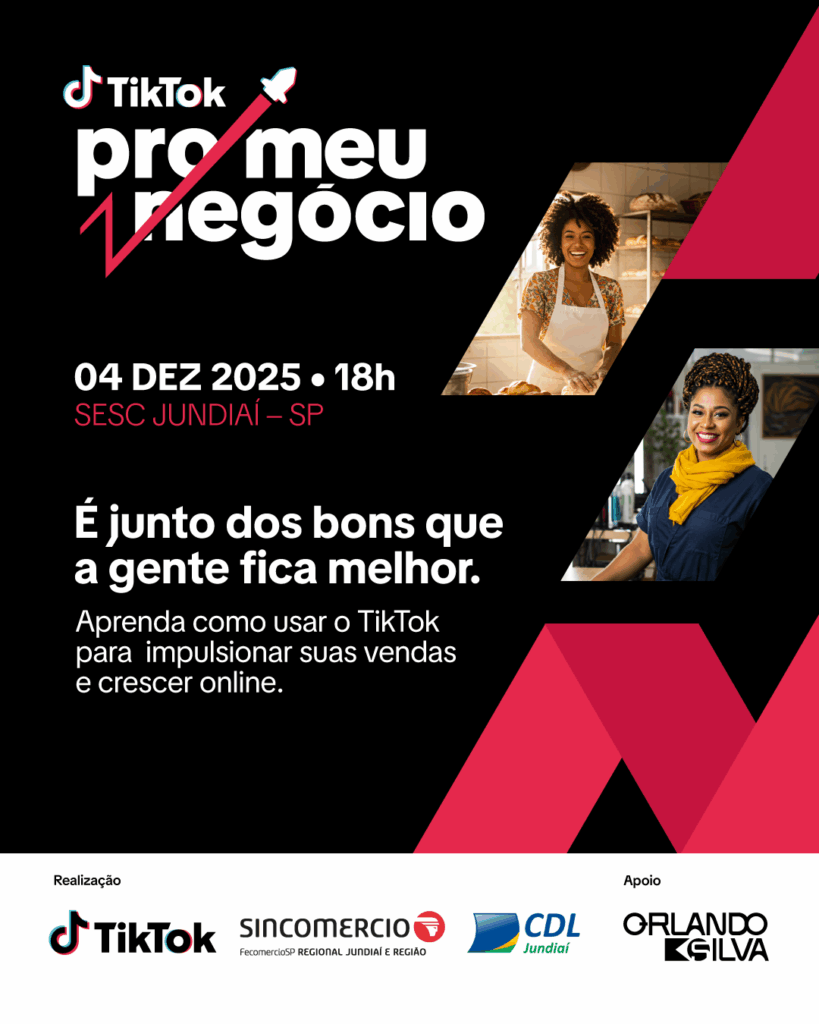 Com entrada gratuita e vagas limitadas, o evento acontece no dia 4 de dezembro (quinta-feira), no Sesc Jundiaí, com credenciamento a partir das 18h. A programação é voltada a empreendedores, lojistas, autônomos e criadores de conteúdo que desejam iniciar ou fortalecer sua presença digital e aprender a usar o TikTok de forma estratégica para expandir negócios e conquistar novos públicos.